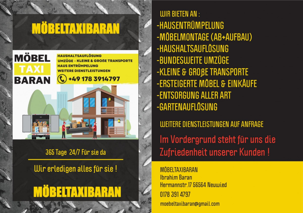Sie wollen günstig, schnell und unkompliziert Möbel, Kühlschrank, Fernseher… oder andere Lasten in Neuwied, Koblenz und Umgebung transportieren? Wir holen sie auch ab von Baumärkten und Möbelhäuser oder auch wenn sie etwas über Ebay gekauft haben. Dann nehmen Sie doch einfach Möbeltaxi Baran! Rufen Sie an und wir kommen zum Wunschtermin vorbei!